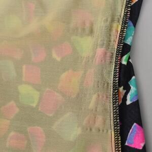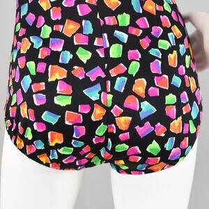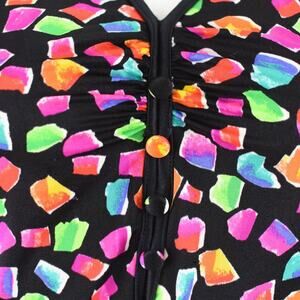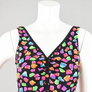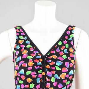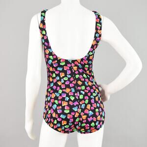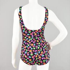 Vintage Maxine of Hollywood one piece swimsuit. Solid black backdrop with pops of colorful geometric shapes all over.