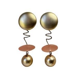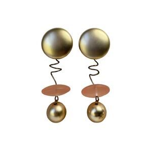 Funky & fabulous satin finish metallic gold & peach plastic & Lucite beads drop dangle retro MCM atomic earrings circa 1980's. Unsigned, each measure 1/2 inch to 1 inch wide by 3-1/4 inches tall. Although pre-owned, the earrings are in excellent condition appearing have never been worn with minor metal to the brass colored wire. No nicks, chips or cracks in plastic. The silver tone clips still fit tight. Please consider the pictures to be part of the description. Don't hesitate to ask any questions.