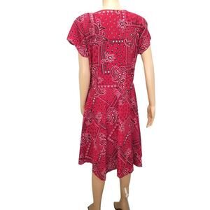 80s Midi Red Kerchief Print Dress Button Short Sleeve Crew Neck VINTAGE Size XL