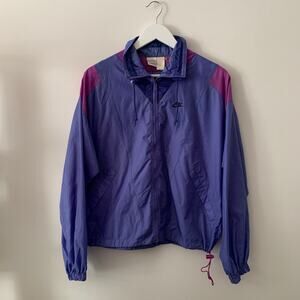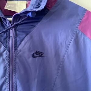 Authentic vintage Nike windbreaker from the 1980s in a striking purple color. Lightweight and breathable, perfect for layering or transitional weather. Features the classic Nike logo, full zip front, elastic cuffs, and adjustable drawstring hem for a comfortable fit. Excellent condition with no major flaws—well preserved for its age.