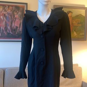 80’s OBERON LBD BLACK CREPE DRESS. Your style doesn’t shout, it’s a whisper.Chic LBD with so much presence. Portrait collar with ruffle,4 front self covered buttons,sleeves have flirty ruffle at cuffs. Kick slit in back hem. Vertical seaming skims over your curves to accent your hourglass silhouette.Perfect for cocktail hour, wedding guest any occasion where you need to be polished and put together.Fully lined in black satin.No smoke,odors or pets. No stains or tears.Size tag is 10, but AS ALWAYS, please see photos for measurements as this is vintage.