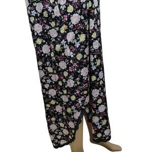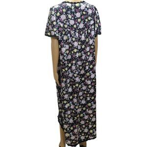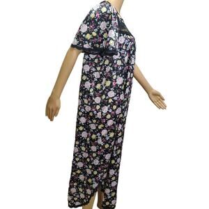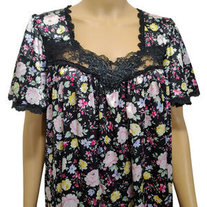 80s Pink Black Floral Christian Dior Nightgown Lounge Wear House Dress. Pullover with short sleeves and a short split on both sides. Scalloped lace edges. Loose wide cut.