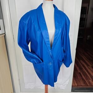 80s Retro Blue Leather Blazer Jacket Vintage Size L