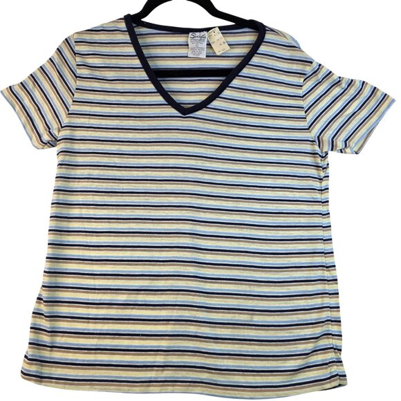 80s Retro Striped V-Neck Short Sleeve Shirt Large Twee Boho Hipster Deadstock