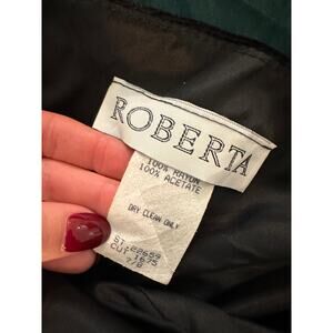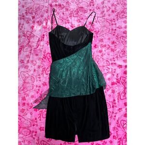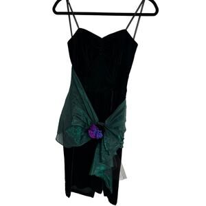 Step into your main character era with this rare vintage Y2K Roberta party dress. Crafted from luxe black velvet, this strappy mini features a dramatic green organza sash that wraps the waist and ties in the back, complete with a purple rosette for that iconic early 2000s glam moment. The flattering sweetheart neckline, adjustable straps, and curve-hugging silhouette give all the “formal dance flashback” vibes.