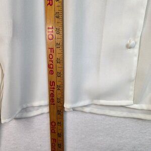 Keywords: Feminine, Vintage Blouse, Ruffle Trim, Susan Bristol, Pleated Collar, Button-Up Top, Long Puff Sleeves, Ruffle Cuffs, Elegant Classic, 70s Fashion, 80s Style, Ivory Blouse, Deadstock, Original Tags, Retro, Flowy, Romantic