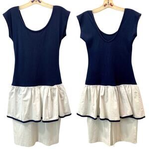 Cute vintage 80s era dress with t shirt top, cotton pencil skirt with peplum, flounce over it. Cap sleeves, unlined, slit at back. Should fall just above knee on most.