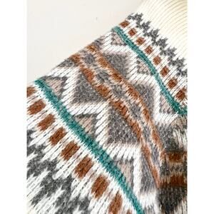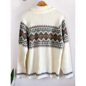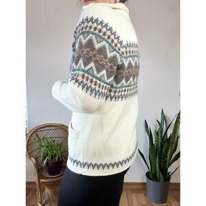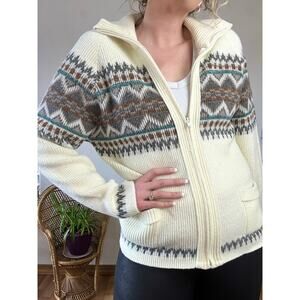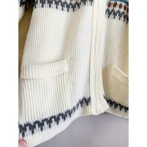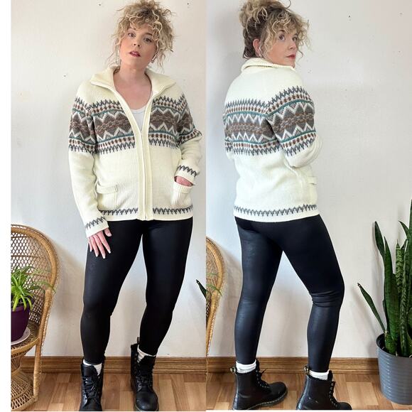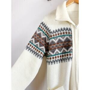 The Dude vibes abound in this fun 80’s zip cardigan. I love the fuzzy texture and the colors! Collar can be turned down or zipped up fully around the neck. It is an off-white rather than a bright white color, very flattering and cozy.