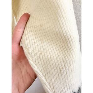 The tag was removed but based on comps I found this is 100% acrylic and London Fog is the brand. Overall in good condition, but there are some light marks on the back of one arm and inside the sweater and there is some scattered pilling.
