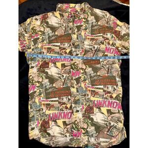AMAZING 100% SILK SHIRT FROM THE 80'S FEATURING A 1953 COMIC STRIP CALLED "STRANGERS ON SATELLITE C". THE STRIP WAS KNOWN FOR ITS ABOVE AVERAGE ART CREATED BY ARTIST JOHN BELACASTRO, AKA JOHNNY BELL. THIS TOP IS IN EXCELLENT CONDITION (JUST MISSING ONE BUTTON). MARKED XL BUT PLEASE GO BY MEASUREMENTS IN PHOTOS.
