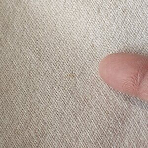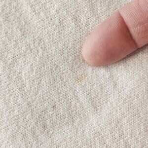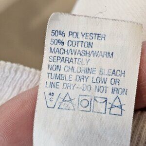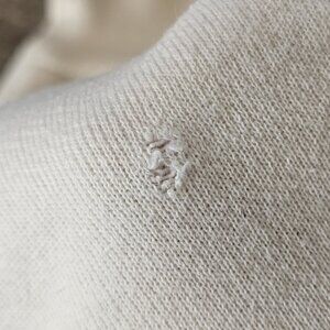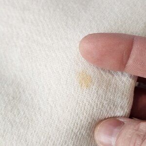 White with some discoloration on cuffs , back sleeve, orange spot on back sleeve amd back as shown, snag on side sleeve