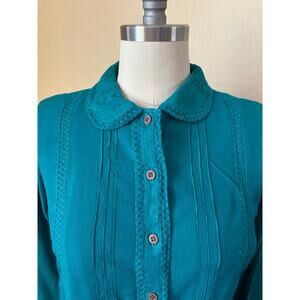 Add a touch of nostalgic charm to your wardrobe with this vintage Star of India button-up blouse in a stunning teal hue. Crafted from soft 100% cotton and made in India, this retro long sleeve shirt features a feminine Peter Pan collar, delicate pintuck details, and crochet trim that echoes romantic cottagecore aesthetics.