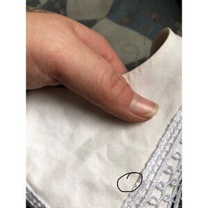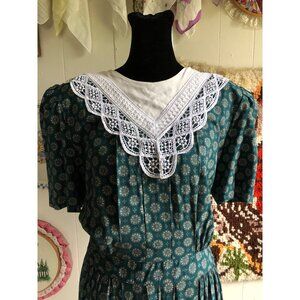 deep green short sleeve midi length day dress with a white lace faux collar accent. geometric pattern. has some slight stretch in the waistband--this is reflected in the measurements. has one flaw on the white faux collar--it's circled in image #5. zips and buttons in the back. it's very small though. tag size has rubbed off but would best fit a size small/medium.