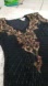 Black 100% silk with black beading allover and gold beads and sequins around the neckline, shoulders, and bottom hem.