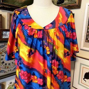 Experience nostalgia with this 80s Vintage Blue Yellow Red Orange Psychedic Floral Sunset Midi MuuMuu. An OSFM piece by Vintage that's perfect for women who appreciate retro style.