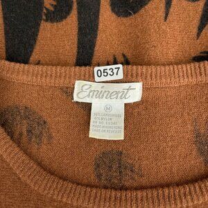 Tags: 1980s, vintage sweater, wool blend sweater, Eminent clothing, women's fashion, patterned sweater, brown sweater, black accents, vintage fashion, long sleeve sweater, unique design, cozy sweater, professional wear, classic style