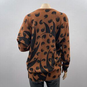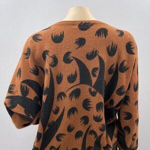 Tags: 1980s, vintage sweater, wool blend sweater, Eminent clothing, women's fashion, patterned sweater, brown sweater, black accents, vintage fashion, long sleeve sweater, unique design, cozy sweater, professional wear, classic style