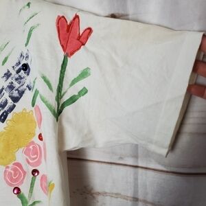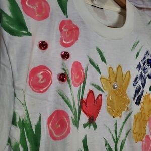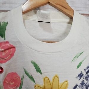 80s Vintage India Ink White Hand Painted 3D Floral Short Sleeve Blouse Size XL