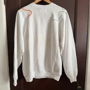 White Crewneck sweatshirt with Neon Pastel Spandex, sewn stars and lightening bolts, and sequin embellishment that goes over to the back