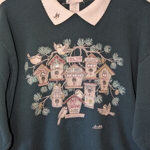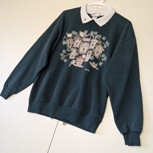 This cozy vintage sweatshirt by Morning Sun features a charming birdhouse graphic with intricate embroidered details on the front and back. Made of soft, dark green fabric, it includes a white ribbed collar with a small bird embroidery, adding a unique touch. Perfect for nature lovers or bird enthusiasts, this sweatshirt blends comfort and style, making it ideal for casual wear or cozy winter days.