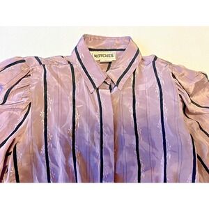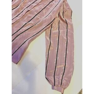 RARE! 80s Vintage NOTCHES Pink Black Striped Silk Blouse Puff Sleeves
