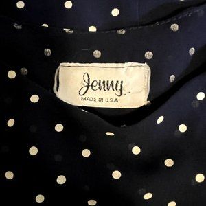 Show off your retro style with Jenny's 80s Vintage Navy Blue and White Scoop Neck Tulip Sleeve Dress with Side Ties. This XL size dress is made from comfortable polyester, perfect for any woman looking to make a statement.