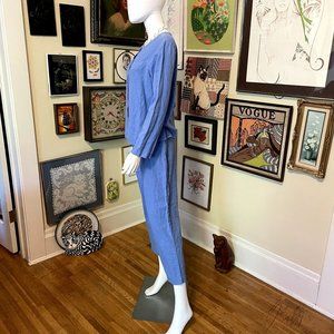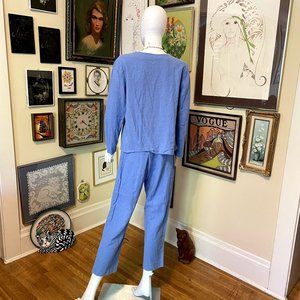 80s Vintage Palisades Blue 100% Linen Long Sleeve Button Front Top and Pant Set