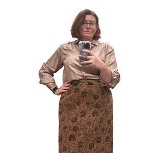 Make this vintage blouse a neutral wardrobe staple for Fall! It's a tan to burnished gold in color (has some light shimmer depending on the lighting). It's from MZZZ by Stuart Lang and is most likely from the 80s. There is no materials tag and you can wash itm so likely poly, but light weight and silky feeling - very comfortable to wear. It's tagged a size 42 which should fit up to about a modern 1X to 2X depending on your measurements. I'm a modern 14/16 and tend to be smaller on the top. I'm wearing it in the photos and I have it tucked in more in the back to give me the outline I wanted. I'm wearing a 38C bra and it's buttoning without issue. Please read the measurements below for exact details. In great condition and the whole outfit (skirt and chain belt) are also available in the shop.