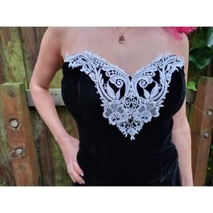 Scott McClintock Black 80's velvet pencil dress with a white lace appliquéd strapless sweetheart neckline. Back zipper with side and princess seemed boning. Midi length skirt with back slit. Waist- 29 inches Hip- 37.5 inches