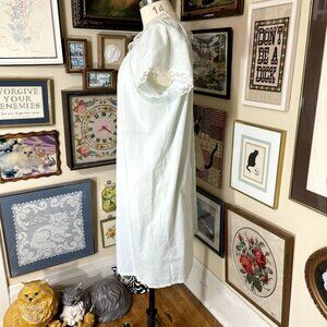 This 80’s Vintage Sears pastel green nightgown exhibits timeless elegance. Light and comfortable, it features a button front, a midi length, and delicate lace detailing. Perfect for women who appreciate vintage fashion.