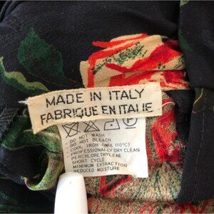 Gorgeous red and cream floral print blouse on a black background. Features long sleeves with zippers at cuffs, higher drapey neckline, functional buttons down the back. Made in Italy, no fabric tag, possibly a silk blend.