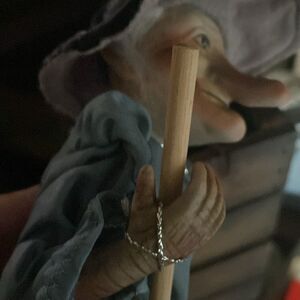 Add a touch of vintage charm to your Halloween decor with this delightful 1980s witch doll. Featuring a whimsical white mouse perched on her hat, this unique decoration is perfect for adding a spooky yet playful element to your seasonal display.
