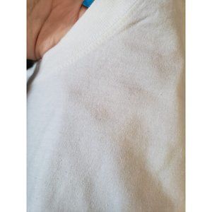 This tee is jn great structural condition but due to some very light discoloration I suspect you may like to dye it. 100% cotton
