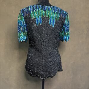 80s Women Stenay Sequin Blouse Top Black Blue Green Beaded Party Glam Occasion