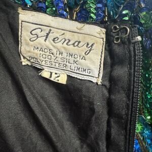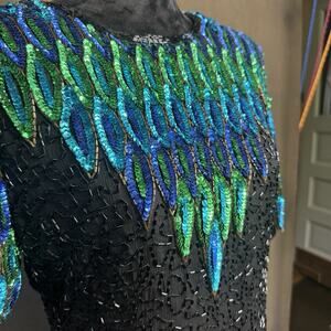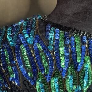 Beautiful vintage Stenay 100% silk blouse with dazzling hand-sewn sequins and beads in a black, green, and blue “peacock feather” pattern. Classic 1980s eveningwear top—perfect for cocktail parties, holiday events, or collectors of vintage glam fashion.