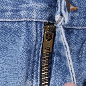 Distressing on front and on ankles. Hole in right knee and back pocket.