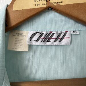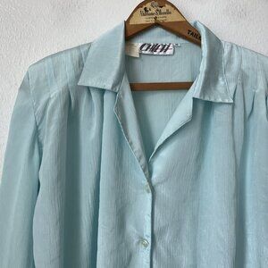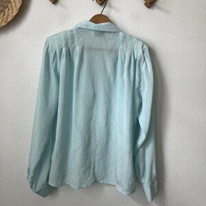 80s aqua crepey chiffon blouse pleat shoulders button long sleeve secretary L