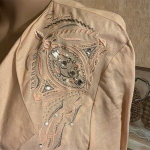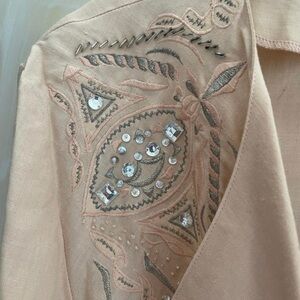 Lightweight 80s blazer/jacket in peachy pink. Has sequins on the shoulders. Has embroidery and gems on the front. Two button closure. 3/4 sleeves.