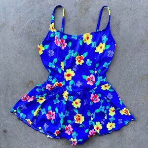 80s neon one piece swimsuit with bright blue and yellow floral pattern, adjustable straps, and elastic waist.