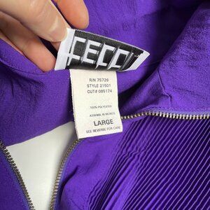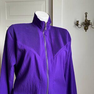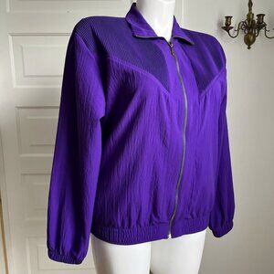 Lovely royal purple 80s zip up jacket with pockets. Made from polyester, light weight, pin tuck details on chest, shoulder pads. Tag says Large but see measurements for more accurate sizing.