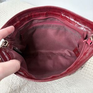 80s/90s Vintage Burgundy Red Eelskin Leather Purse Shoulder Bag. Top zip closure. Lined interior with zip pocket. Removable shoulder/crossbody strap. Measures 10.5”x8”x1.5” with 17” strap drop. Retro vibes. Excellent condition with light interior staining. Please see all photos.