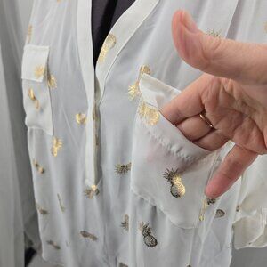Brand new Torrid Harper Georgette Blouse in size 0 (fits like a women’s L/12). This lightweight white blouse features a playful allover gold foil pineapple print that adds a fun twist to a polished silhouette. Designed with a split neckline, concealed button placket, chest pockets, and ¾ roll-tab sleeves for versatile styling. The shirttail hem gives it a flattering drape, perfect for both casual and dressy looks. Made from smooth polyester georgette. Machine wash cold and dry low.