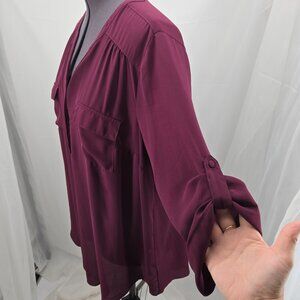 Looking for a stylish and versatile top? This Torrid Harper hi-low tunic blouse in Size 2 (fits 18/20) is a beautiful piece that blends comfort with a touch of elegance. The color is a rich purple/burgundy and is deeper than appears in photos, which tend to make it look a bit pinker. It features two front pockets, three chest buttons, and ¾ sleeves that you can wear down or cinch up for a more casual look. The hi-low hem adds a flattering silhouette, with the front measuring about 30" and the back flowing down to 33". Made from 100% polyester, it's easy to care for, just machine wash cold and tumble dry low. Perfect for layering or wearing solo, this blouse transitions effortlessly from work to the weekend.