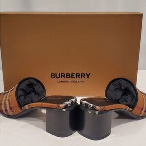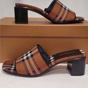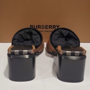 $820 Burberry Wilma Check Block-Heel Mules Sandals Dark Birch Brown EU 37 / US 7