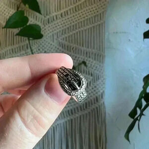 This sterling silver ring features several small dark and clear Cubic Zirconia and a unique design fashioned after a belt buckle.