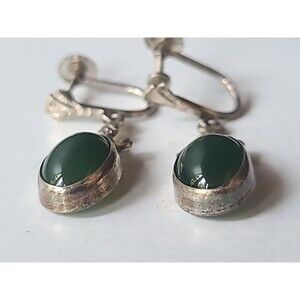 835 Silver Oval Nephrite Dangling Screwback Earrings Vintage