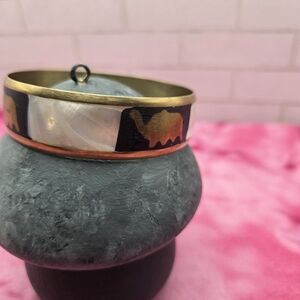 838. Vintage Brass And Mother Of Pearl Inlay Elephant Bangle. Size 8. A perfect addition to your jewelry collection. In amazing preloved condition.