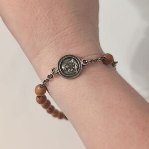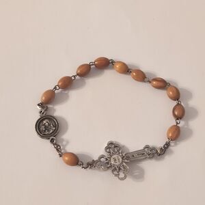 Wood Beaded Silver Chain Link Silver Cross and Charm Religious Bracelet