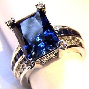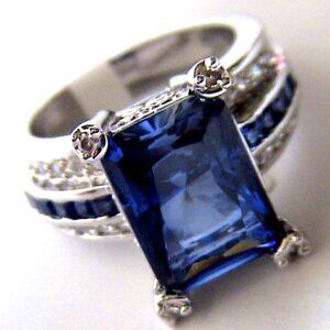Beauty for Ashes® Boutique Jewelry presents Tabernacle Cz Ring! Super Sparkly and RARE to find such remarkable quality in this size sapphire cz. It's size is 3/8" x 5/8", and has an emerald-cut sapphire CZ. Prongs each carry a mini clear cz! The prong-set shank shimmers with sapphire and clear micro-mini gems. The carat weight 8.47 for the center stone only. Brass base with white gold (rhodium) plating.