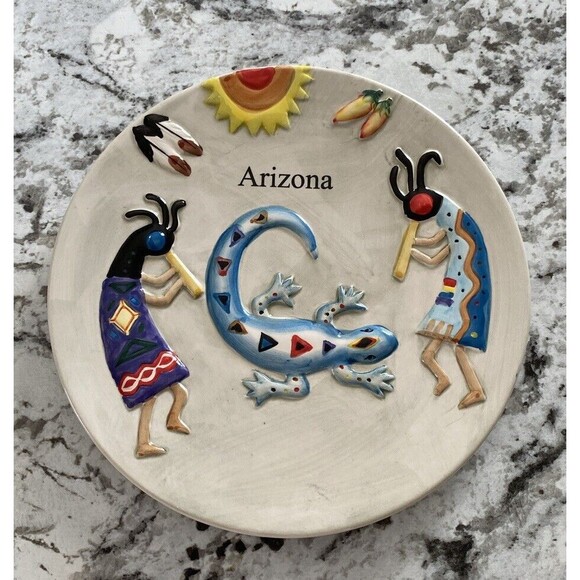 8.5" Kokopelli Raised Figures Arizona Dish Bright Colors Dancing Figures Gecko